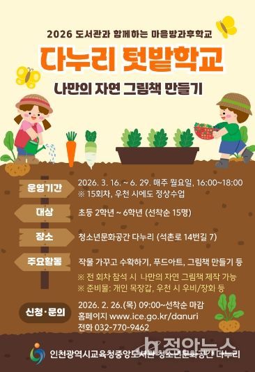 정안뉴스 안정주 기자 | 인천광역시교육청중앙도서관 청소년문화공간 다누리는 26일부터‘다누리 텃밭학교: 씨앗에서 그림책까지’ 참여자를 모집한다.