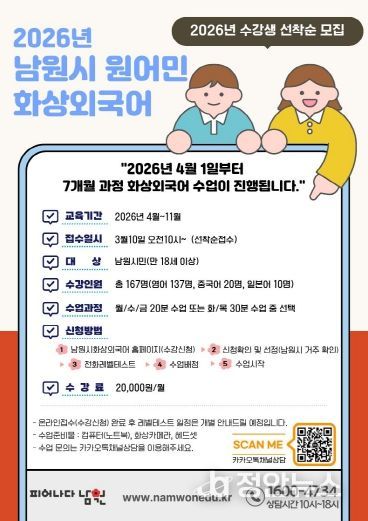 정안뉴스 안정주 기자 | 남원시가 시민들의 어학 실력 향상과 글로벌 역량 강화를 위해 오는 3월 10일부터 ‘2026년 원어민 1:1 화상외국어 교육’ 수강생을 선착순으로 모집한다.