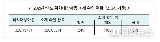 학교 ‧ 지방자치단체 ‧ 관할 경찰서가 협력하여 취학대상아동의 소재와 안전을 확인한 결과, 올해 취학대상아동 총 320,157명 중 99.9%에 해당하는 320,033명의 소재를 최종 확인했다.