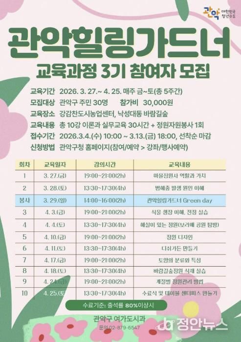 ‘관악 힐링 가드너’는 단순한 이론 교육을 넘어 주민들이 직접 동네 녹지를 가꾸고 돌보는 실천형 마을 정원사를 양성하는 사업이다. 구는 지난 2025년 1·2기 교육 당시 높은 경쟁률과 만족도를 기록하며 지역 내 정원문화 확산을 위한 기반을 성공적으로 다진 바 있다.