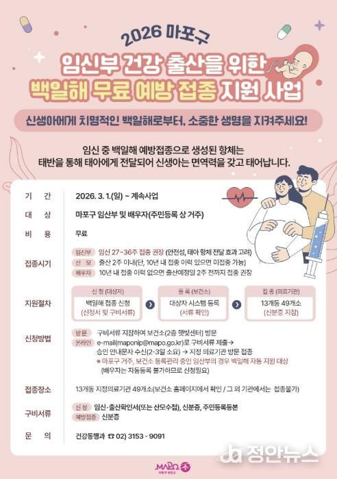 정안뉴스 안정주 기자 | 마포구는 3월 1일부터 지역 내 출산을 앞둔 예비부모를 대상으로 백일해 무료 예방접종을 지원한다.