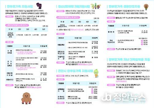 이 외에도 △자녀학습비 및 월동비 지원 △취약·위기가족 사례관리 △한부모가족복지시설을 통한 보호 및 자립 지원 등 천안시와 정부가 추진하는 주요 복지 정보가 수록됐다.