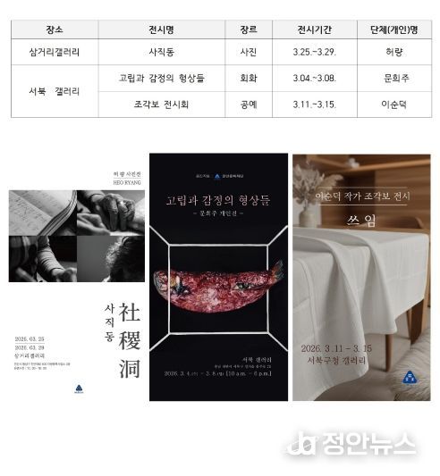 삼거리갤러리에서는 ‘사직동’ 사진전을, 서북갤러리에서는 ‘고립과 감정의 형상들’회화전과 ‘조각보 전시회’ 공예전을 만나볼 수 있다.