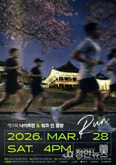 정안뉴스 김재홍 기자 | 밀양문화관광재단은 오는 3월 28일 삼문동 밀양강 둔치 일원에서 벚꽃 철을 맞아 지역 야간관광 활성화를 위한 이색 러닝 축제 ‘제3회 나이트 런 앤 워크 인 밀양(Night Run & Walk in Miryang)’을 열고, 3월 22일까지 참가자를 모집한다.