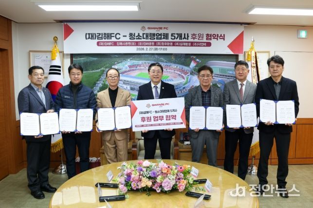 김해FC는 27일, 김해시 청소대행업체 5개사와 구단 후원을 위한 업무 협약을 체결했다고 밝혔다. 이번 협약에 참여한 업체는 ▲김해시공영(유) ▲(유)김해공영 ▲㈜정우환경 ▲㈜김해환경 ▲㈜지엔비로, 후원금은 김해FC 운영 및 경기 활동 전반에 사용될 예정이다.
