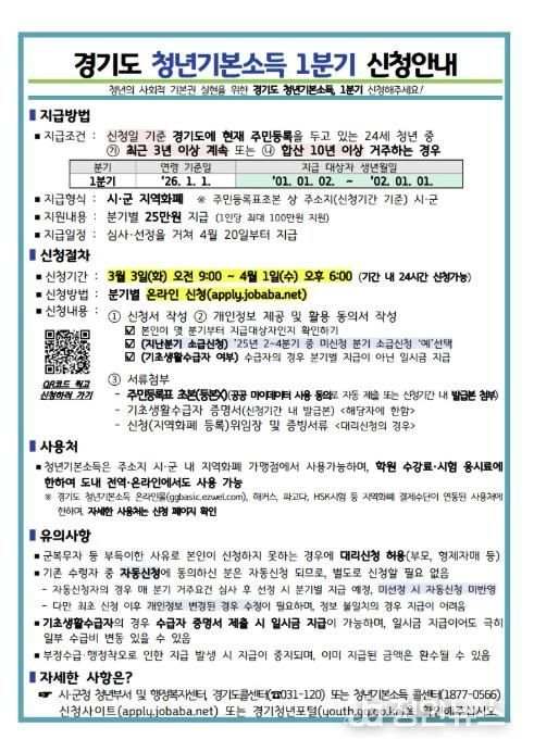 정안뉴스 안정주 기자 | 동두천시는 2026년 1분기 청년기본소득 신청․접수를 3월 3일부터 4월 1일까지 한 달 간 접수한다고 밝혔다.