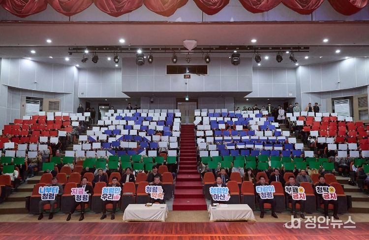 정안뉴스 황도연 기자 | 아산시 감사위원회(위원장 김점균)는 3일 오전 아산시청 시민홀에서 청렴 선포식과 공직자 청렴교육을 개최하고 청렴 실천 의지를 대내외에 선언했다.