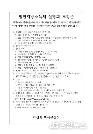 정안뉴스 안정주 기자 | 화성특례시 만세구청은 오는 3월 10일 오후 2시 세무대리인 등을 대상으로 법인지방소득세 설명회를 개최한다고 밝혔다.