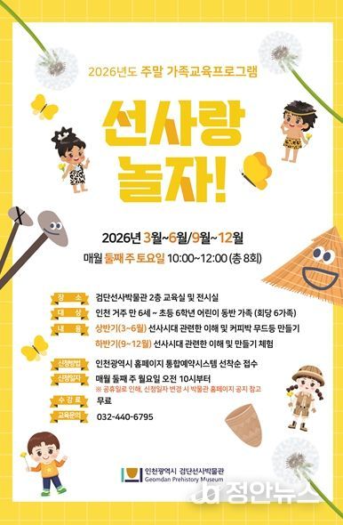정안뉴스 안정주 기자 | 인천광역시 검단선사박물관은 2026년 새 학기를 맞아 가족이 함께 즐길 수 있는 주말 가족교육프로그램 '선사랑 놀자!'를 운영한다고 밝혔다.