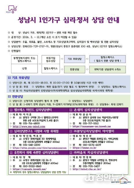 정안뉴스 안정주 기자 | 성남시는 우울감이나 외로움, 불안감, 스트레스로 어려움을 겪는 1인 가구에 전문적인 심리·정서 상담을 지원한다고 5일 밝혔다.