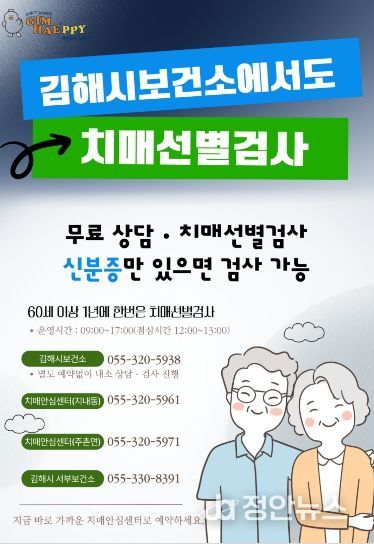 정안뉴스 김재홍 기자 | 김해시는 김해시보건소에서도 치매선별검사를 받을 수 있다고 6일 밝혔다.