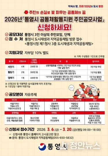 정안뉴스 김재홍 기자 | 통영시는 주민 스스로 계획하고 공동체적 방식으로 추진하는 활동을 지원하기 위해 2026년'통영시 공동체활동지원 주민공모사업'에 참여할 공동체를 오는 6일부터 20일까지 모집 접수한다.