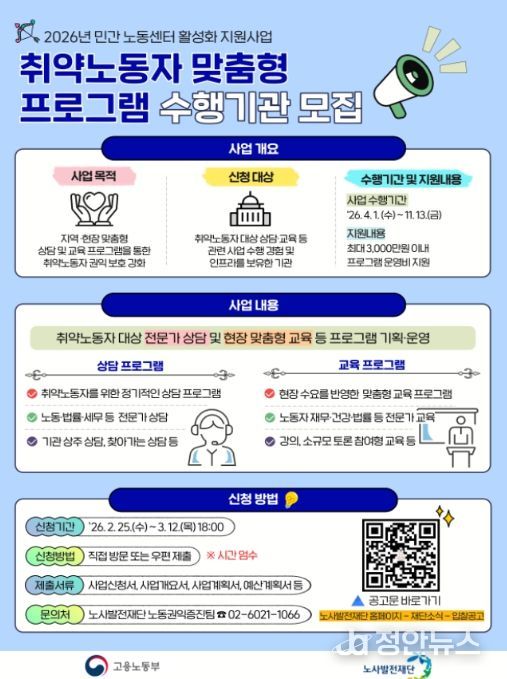 정안뉴스 안정주 기자 | 고용노동부 노사발전재단은 민간 노동센터·비영리단체 등이 지역별 특성과 취약노동자의 다양한 노동환경을 반영한 맞춤형 프로그램을 기획·운영할 수 있도록 '2026년 취약노동자 맞춤형 프로그램' 지원 사업을 추진한다고 밝혔다.