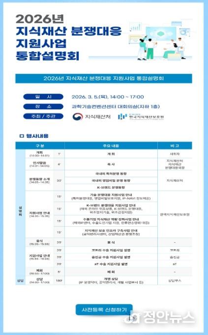 이를 위해, 지식재산처는 3월 5일 과학기술컨벤션센터(서울 강남구)에서 2026년 지식재산 분쟁대응 지원사업 통합설명회를 개최한다고 밝혔다. 본 설명회에서는 지식재산처의 지식재산 분쟁대응 지원사업과 대한무역투자진흥공사, 중소벤처기업진흥공단, 한국농수산식품유통공사의 수출 지원사업을 함께 소개하고, 지식재산 전문가를 통한 현장상담도 진행한다.