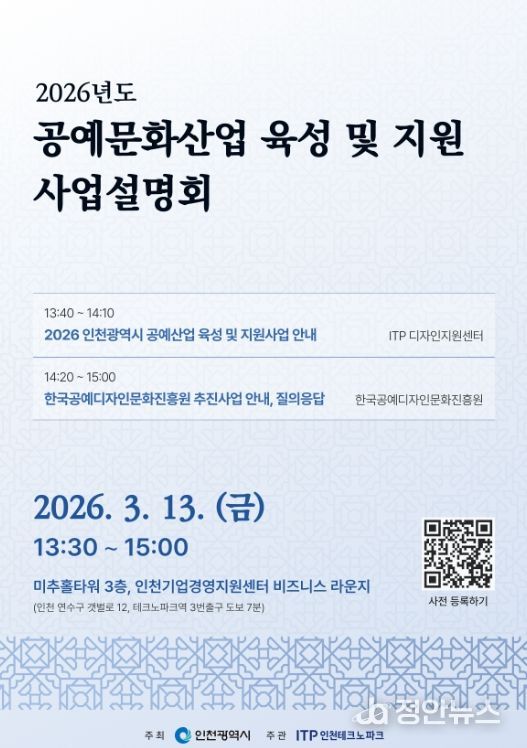정안뉴스 안정주 기자 | 인천테크노파크(인천TP)는 오는 13일 인천기업경영지원센터(송도 미추홀타워 3층)에서 ‘2026년도 인천광역시 공예문화산업 육성 및 지원사업 설명회’를 개최한다고 밝혔다.