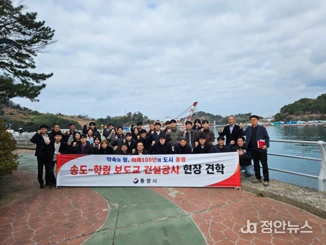 정안뉴스 김재홍 기자 | 통영시는 지난 5일 산양읍 송도와 학림도를 잇는‘송도~학림 보도교 건설공사’현장에서 토목직 공무원들 40여 명을 대상으로 현장 견학 및 기술 연찬을 실시했다.