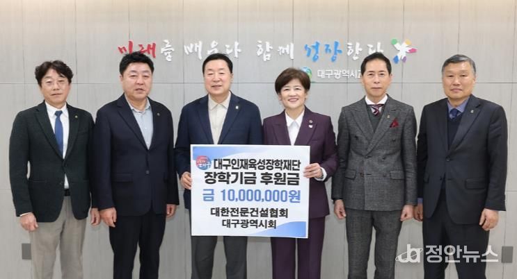 정안뉴스 안정주 기자 | 대구시교육청은 3월 5일 대한전문건설협회 대구광역시회가 장학금 1천만원을 대구인재육성장학재단에 기탁했다고 밝혔다.