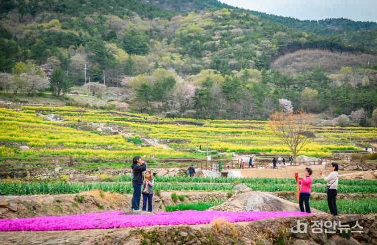 층층이 쌓인 계단식 논에 유채꽃이 흐드러지게 피어, 남해 특유의 지형과 바다가 만들어낸 이색적인 봄 풍경을 배경으로 '인생 사진'을 남기려는 관광객들의 발길이 이어지고 있다.