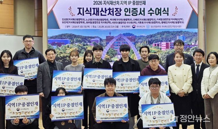정안뉴스 김재홍 기자 | 경상국립대학교지식재산전문인력양성사업단은 3월 5일 법과대학 김순금홀에서 지식재산 실무인재 양성을 위한 ‘지역 IP 중점인재’를 선발하고 인증서를 수여했다.
