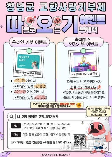정안뉴스 김재홍 기자 | 창녕군은 고향사랑기부제 참여 확대와 기부 문화 확산을 위해 ‘따.오.기.(따블로 오는 기부 혜택) 이벤트’를 추진한다.