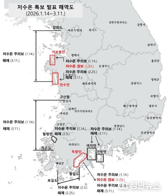 정안뉴스 안정주 기자 | 해양수산부는 3월 11일 12시부로 저수온 특보를 전면 해제하고, 위기경보 단계를 ‘경계’에서 ‘관심’으로 하향한다고 밝혔다.