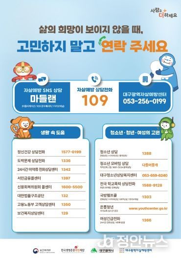 정안뉴스 안정주 기자 | 대구광역시는 봄철 자살률 증가에 대비해 3월부터 5월까지 자살예방 집중관리 기간을 운영하고, 시민들이 위기 상황에서 도움을 받을 수 있도록 상담서비스 안내와 자살예방 홍보를 강화한다.