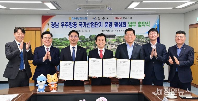 정안뉴스 김재홍 기자 | 진주시는 16일 시청 기업인의 방에서 NH농협은행, BNK경남은행과 ‘경남 우주항공 국가산업단지 분양 활성화’를 위한 업무협약을 체결했다고 밝혔다.