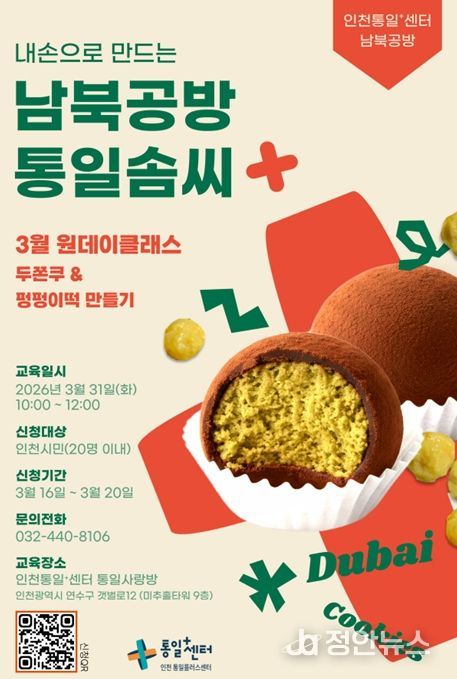 참가자 모집은 시 홍보매체와 인천통일플러스센터 사회관계망서비스(SNS) 및 블로그를 통해 공지하며 제1차 남북한 간식문화 '두쫀쿠·펑펑이떡 만들기' 클래스는 현재 신청 접수 중이다.