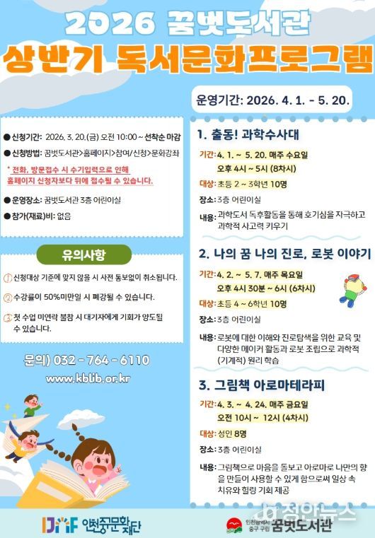 정안뉴스 안정주 기자 | (재)인천중구문화재단은 오는 4~5월 ‘구립 꿈벗도서관’에서 진행될 ‘2026 상반기 독서 문화프로그램’의 참여 수강생을 선착순 모집한다고 17일 밝혔다.
