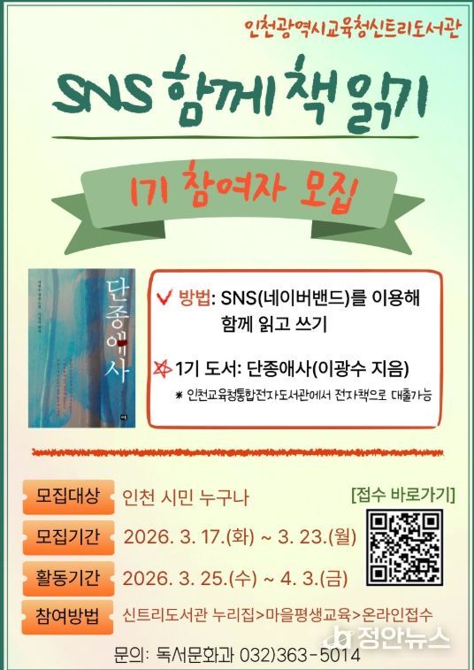 정안뉴스 안정주 기자 | 인천광역시교육청신트리도서관은 인천 시민의 일상 속 독서 실천을 지원하기 위해 온라인 독서 프로그램 ‘2026년 SNS 함께 책 읽기’를 운영한다.