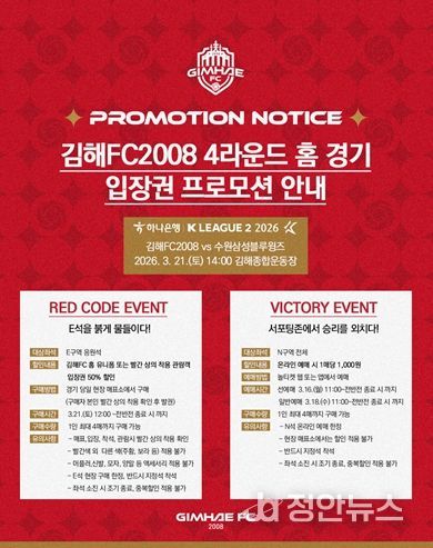 정안뉴스 김재홍 기자 | 김해FC2008이 오는 21일 오후 2시 김해종합운동장에서 열리는 수원삼성블루윙즈와의 ‘하나은행 K리그2 2026’ 4라운드 홈 경기를 앞두고, 첫 승을 기원하는 대대적인 할인 프로모션을 진행한다고 밝혔다.