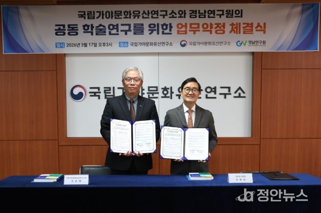 정안뉴스 김재홍 기자 | 경남연구원과 국립가야문화유산연구소는 17일 국립가야문화유산연구소에서 경남 지역 문화유산의 체계적인 조사와 연구 협력 강화를 위해 업무협약을 체결했다.
