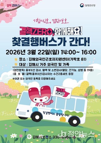 정안뉴스 김재홍 기자 | 김해시는 제16회 결핵예방의 날(3월 24일)을 맞아 오는 22일 오후 2시부터 4시까지 김해외국인근로자지원센터에서 '찾아가는 외국인 무료 결핵검진'을 실시한다고 18일 밝혔다.