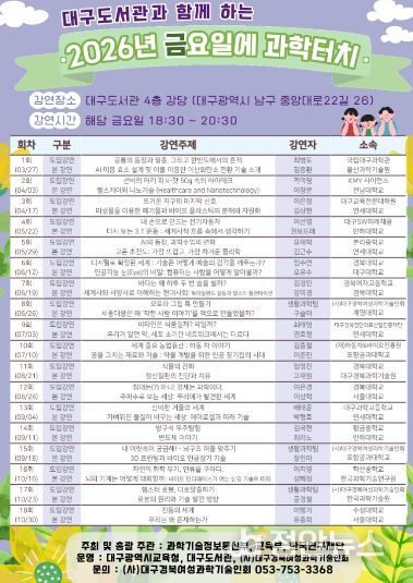 정안뉴스 안정주 기자 | 대구도서관은 시민들에게 최신 과학기술과 연구 성과를 쉽고 흥미롭게 전달하기 위해 ‘2026년 금요일에 과학터치’ 프로그램을 본격 운영한다.