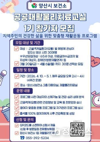 모집 인원은 30명이며, 65세 이상 어르신, 의료급여 수급자, 차상위계층, 장애인 등은 우선 접수 대상이고 양산시보건소 1층 재활물리치료실로 방문 또는 보건소 홈페이지에 업로드된 QR코드를 통해 신청 가능하다.