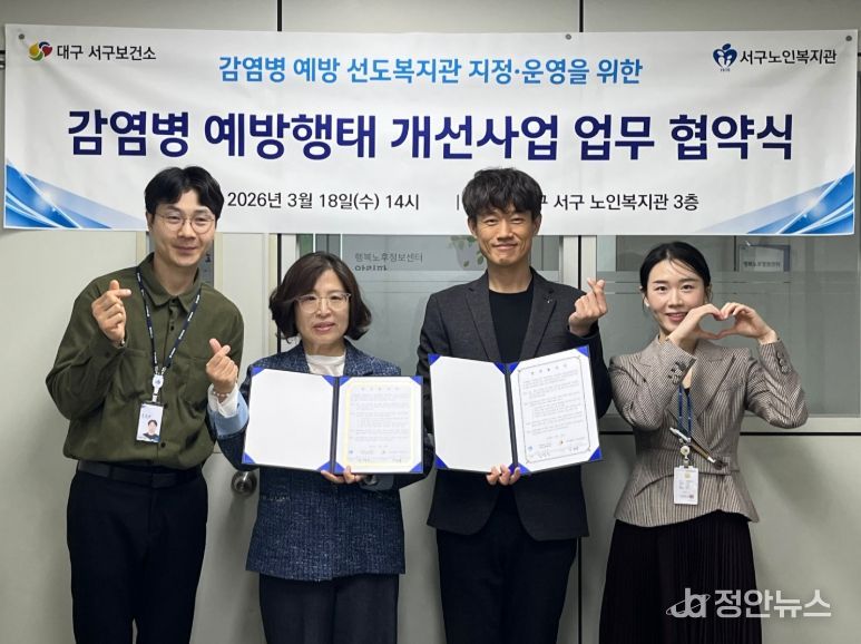 정안뉴스 안정주 기자 | 대구 서구보건소는 18일, 서구노인복지관(사회복지법인 가정복지회)을 ‘감염병 예방 선도복지관’으로 지정하고, 원활한 운영을 위한 업무협약을 체결했다.
