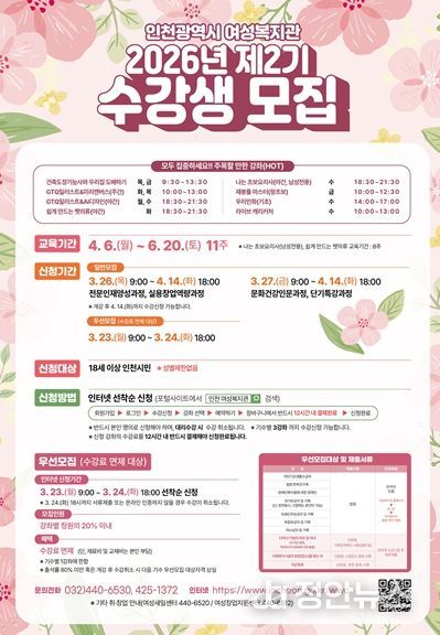 정안뉴스 안정주 기자 | 인천광역시 여성복지관은 오는 3월 23일부터‘2026년도 제2기 사회교육강좌’수강생을 모집한다고 밝혔다.