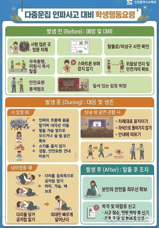 시교육청 관계자는 "학생들의 안전이 무엇보다 최우선"이라며 "경찰청 등 유관기관과 협력해 대규모 인파 밀집 등 다양한 위기 상황에 선제적으로 대응하고 사고 예방에 최선을 다하겠다"고 말했다.