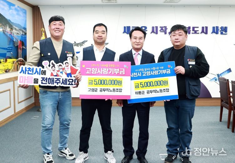 정안뉴스 김재홍 기자 | 사천시(지부장 조현찬)·고성군(지부장 천재호)·하동군(지부장 정석문) 공무직노동조합이 19일 사천시청을 방문해 각 지부별로 500만 원씩, 총 1000만 원의 기부금을 전달하며 돈독한 우정을 다시 한번 확인했다.