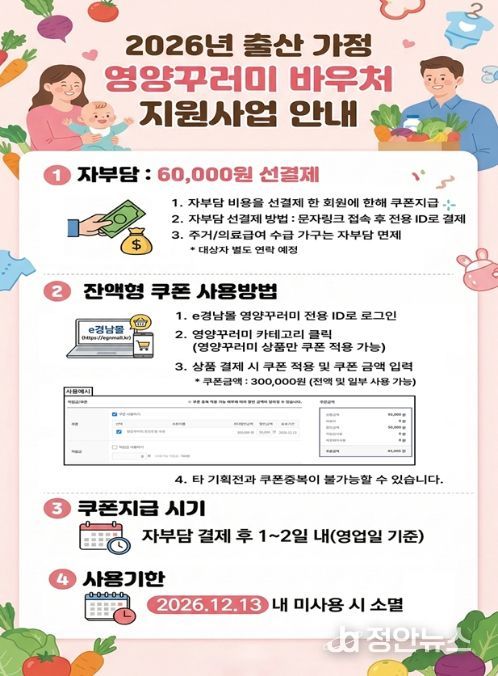 정안뉴스 김재홍 기자 | 경상남도는 영아 출산가정의 건강한 식생활 지원과 경제적 부담 경감을 위해 ‘출산가정 영양꾸러미 바우처 사업’을 23일부터 본격 시행한다고 밝혔다.