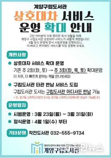 정안뉴스 안정주 기자 | (재)인천광역시계양구인재양성장학교육재단 계양구립도서관은 오는 4월 1일부터 상호대차 서비스 운영을 확대하고, 타관 반납 서비스를 새롭게 도입한다.