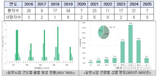 국내 일본뇌염 환자는 평균 17.4명 내외로 발생했고, 대부분 8~9월에 첫 환자가 신고되며 11월까지 발생한다. 최근 5년간 일본뇌염으로 신고된 환자(79명)의 특성을 살펴보면 남성이 60.8%로 여성보다 많았고, 전체 환자의 65.9%가 50대 이상이었다.