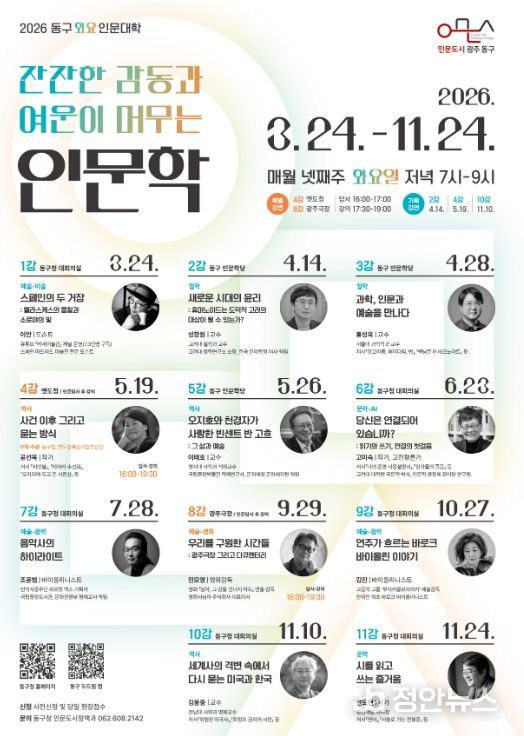 정안뉴스 안정주 기자 | 광주 동구는 ‘잔잔한 감동과 여운이 머무는 인문학’을 주제로 예술, 철학, 역사, 문학 등 각 분야의 명망 있는 강사들을 초청해 진행하는 ‘동구 화요 인문대학’을 24일 개강한다고 밝혔다.