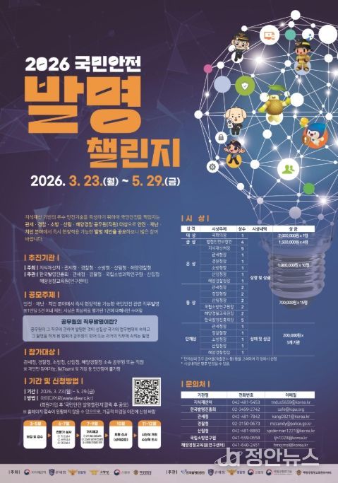 정안뉴스 안정주 기자 | 지식재산처는 관세청, 경찰청, 소방청, 산림청, 해양경찰청과 함께 '2026 국민안전 발명챌린지' 접수를 3월 23일부터 5월 29일까지 진행한다고 밝혔다.