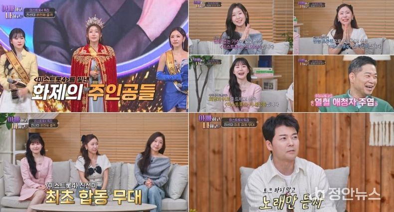 ‘미스트롯4’ 진선미는 이날 ‘아빠하고 나하고’를 위해 특별한 무대를 준비했다. 이들의 합동 무대는 이번주 방송에서 최초로 공개된다. 진선미 완전체가 무대를 바로 앞에서 준비하자, 김정태와 수빈은 “여기서 하는 거예요?”라며 직관 1열의 행운에 환호했다. 진선미의 라이브 무대에 스튜디오의 분위기는 후끈하게 달아올랐고, ‘찐팬’에서 ‘성덕’이 된 현주엽은 어느 때보다도 환한 미소로 무대를 즐겼다. 소름이 돋는 역대급 무대에 전현무는 “토크하지 말고 노래만 계속 듣자”며 진행을 거부했다.