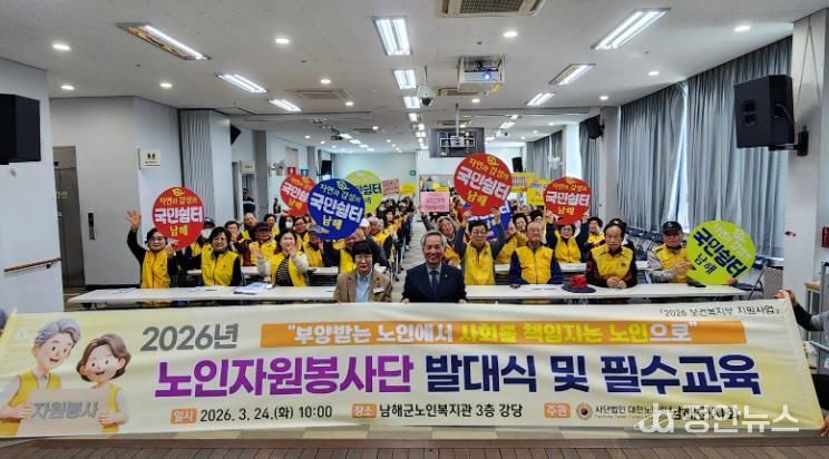 정안뉴스 김재홍 기자 | (사)대한노인회 남해군지회는 지난 24일 남해군 노인복지관 3층 대강당에서 소속 10개 단체 200여 명의 자원봉사 단원이 참석한 가운데 ‘2026년도 남해군 노인자원봉사단 발대식 및 노인자원봉사자 교육’을 성황리에 개최했다.