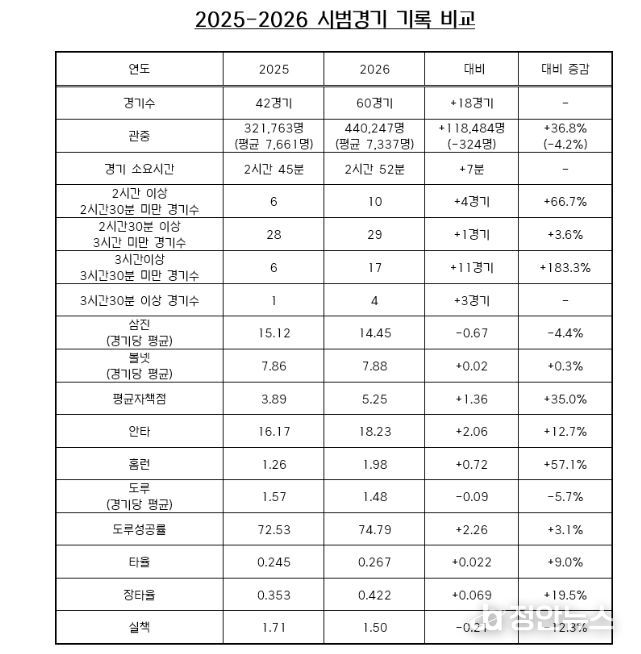 경기 평균 소요 시간은 2시간 52분으로 2025년 대비 7분 늘었으며, 경기당 삼진은 14.45개, 볼넷은 7.88개로 각각 4.4% 감소, 0.3% 증가를 기록했다. 평균자책점은 지난해 3.89에서 5.25로 높아져 35.0%의 증가 폭을 보였다.