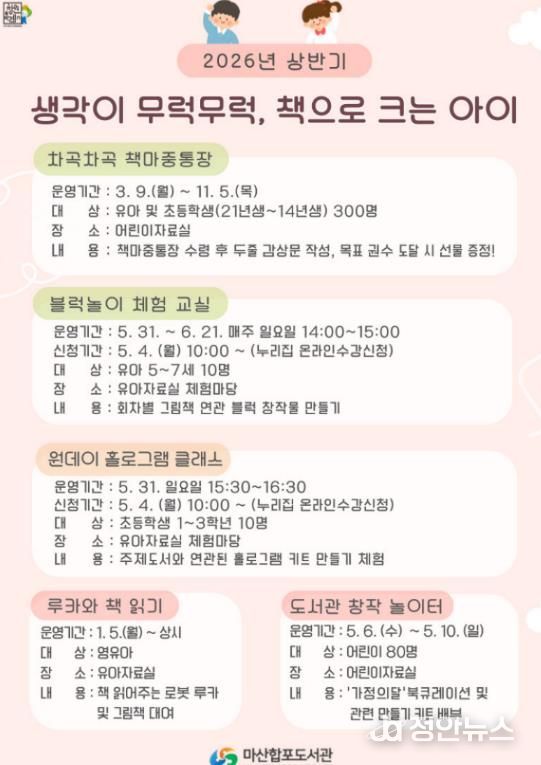 정안뉴스 김재홍 기자 | 창원특례시 마산합포도서관은 어린이를 대상으로 체험과 놀이를 기반으로 한 독서프로그램 ‘생각이 무럭무럭, 책으로 크는 아이’를 3월부터 11월까지 운영한다.