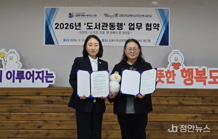 정안뉴스 김재홍 기자 | 김해시학교밖청소년지원센터는 지난 25일 경남도교육청 김해지혜의바다도서관과 학교 밖 청소년 지원을 위한 업무협약(MOU)을 체결했다고 밝혔다.