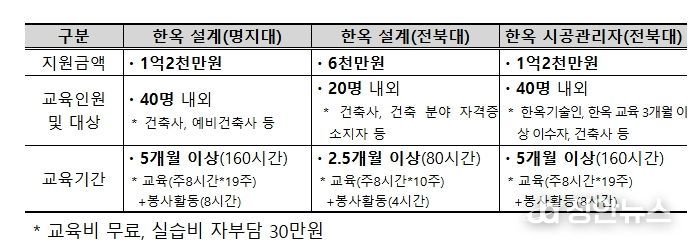 한옥 건축 전문가 양성 지정기관인 명지대와 전북대는 5월부터 매주 토요일(현업 종사자를 위해 주말 수업)에 교육과정을 운영한